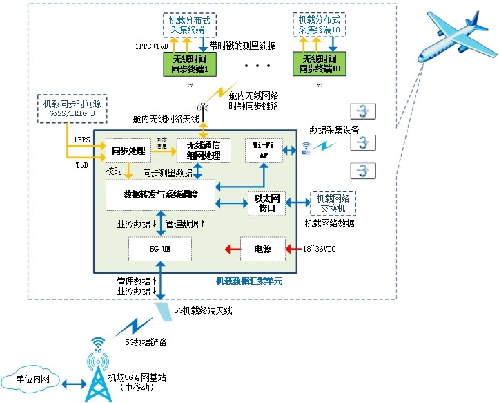 多體制高速無線網絡系統利用機載數據匯聚單元及配套的無線時間同步終端,將各分布式采集終端采集的測量數據,通過艙內無線網絡傳輸至數據匯聚單元;同時可將來自同步時間源(如GNSSIRIG時鐘)的1PPS+TOD同步信息,通過艙內無線網絡高精度(10納秒級抖動)同步傳輸至各無線時間同步終端對外同步輸出,供分布式采集器作為數據采集的同步源,實現分布式并發同步數據采集。